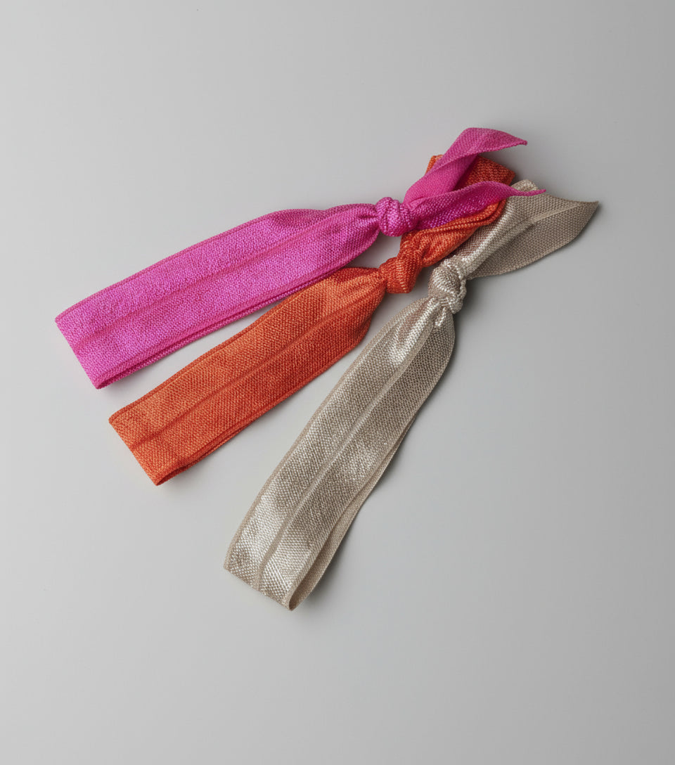 Dieses beiden Sets bestehen aus je 3 elastischen Bändern in frischen und auffälligen Tönen. Die vielseitigen Accessoires eignen sich sowohl als schonende Haargummis, sind jedoch auch als zarte Armbänder ein eleganter, femininer Akzent.