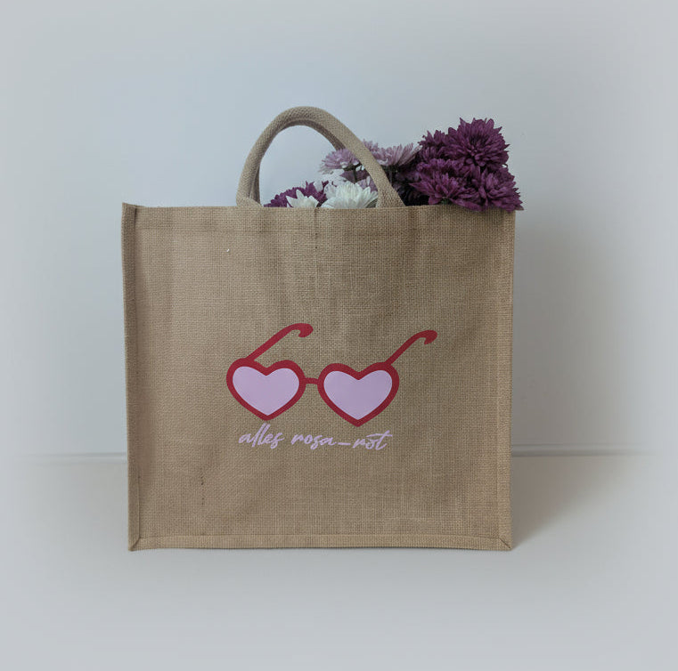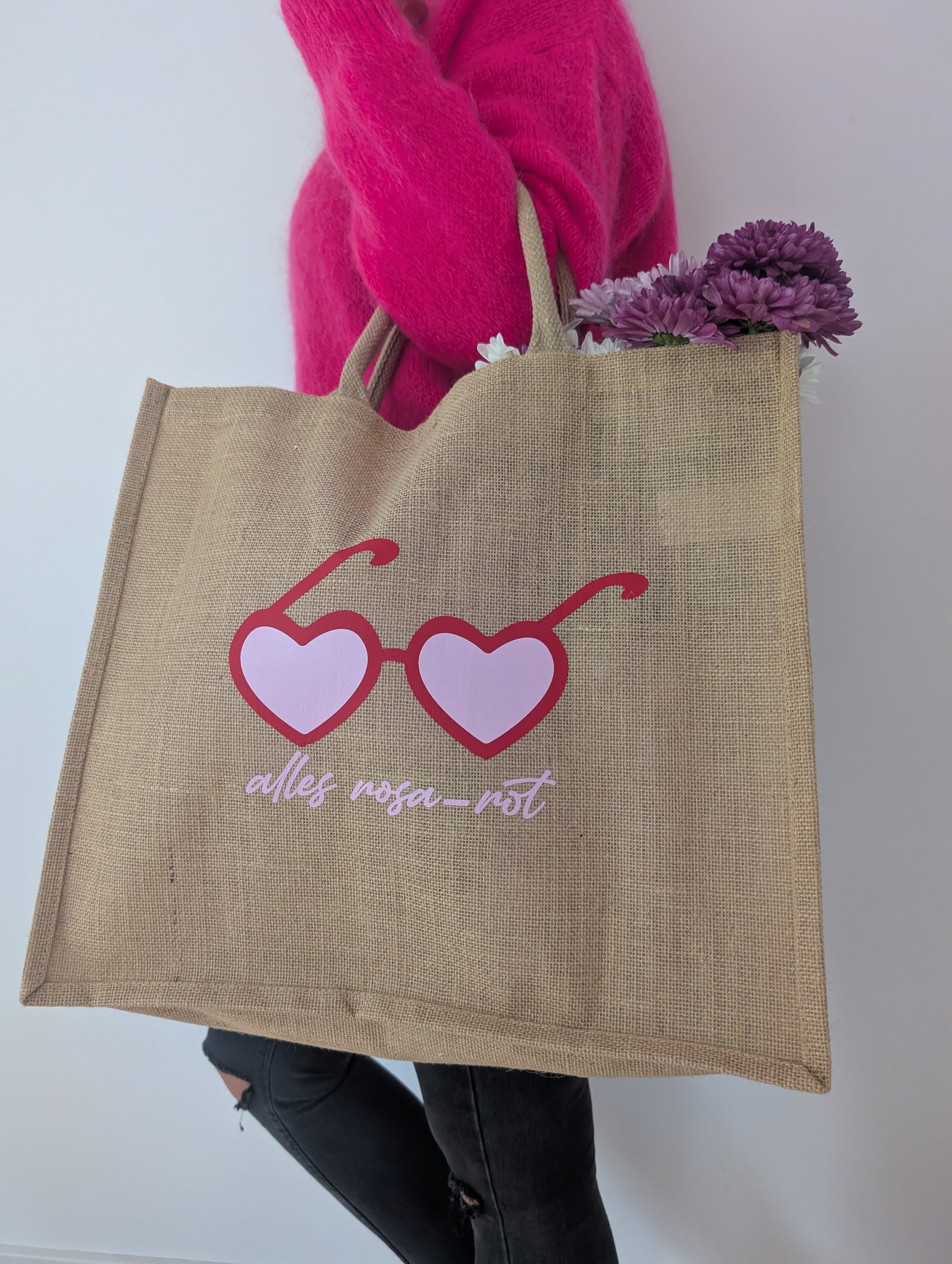 Diese geräumige Jutetasche ist der perfekte Begleiter für den Einkauf. Aus robustem Material gefertigt, bietet sie ausreichend Platz für alle Ihre Vorräte. Das liebevolle Design mit dem süßen Schriftzug „alles rosa-rot“ und der passenden rosa-roten Brille verleiht der Tasche eine verspielte Note. Dank der praktischen Tragehenkel lässt sie sich bequem transportieren und unterstützt Sie stilvoll bei jeder Shopping-Tour.