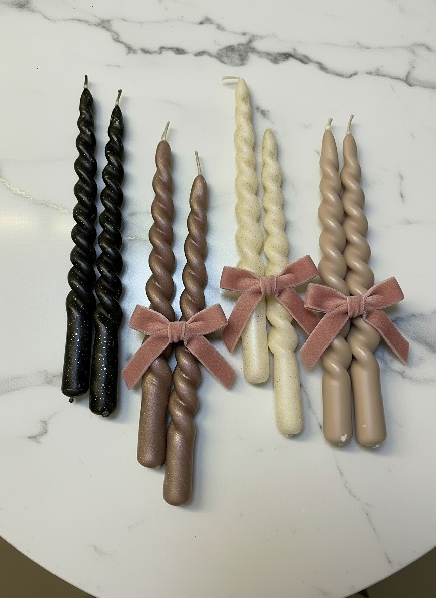 Kerzen-Doppelset in vier exklusiven Varianten im charaktervollen Spirallook. Drei Ausführungen bestehen aus hochwertigen Stabkerzen mit elegantem Goldschimmer, während die vierte Variante in zeitloser Unifarbe überzeugt. Diese durchdachte Zusammenstellung bietet maximale Flexibilität für individuelle Stilvorlieben und ermöglicht harmonische Kombinationen in verschiedenen Raumkonzepten. Ein Statement-Piece für anspruchsvolle Inneneinrichtung.