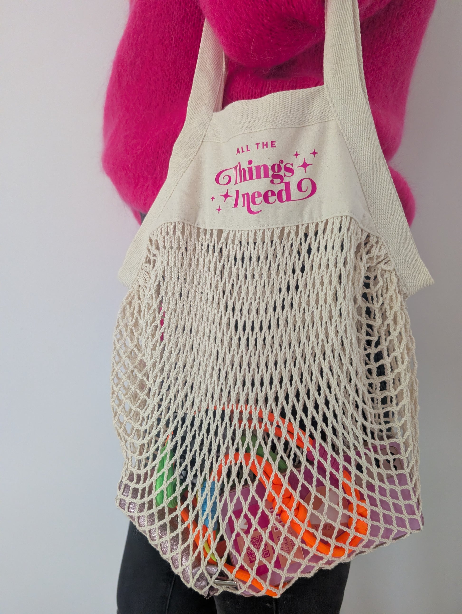 Die Netztasche "All the Things I Need" verbindet Alltagstauglichkeit mit einem charmanten Design. Ideal für Einkäufe oder Stadtbummel, bietet sie ausreichend Platz für alles Wichtige. Der schlichte Look wird durch einen witzigen Spruch zum stilvollen Hingucker, der Ihren persönlichen Stil unterstreicht. Robust und leicht, begleitet sie Sie zuverlässig bei Ihren täglichen Erledigungen.