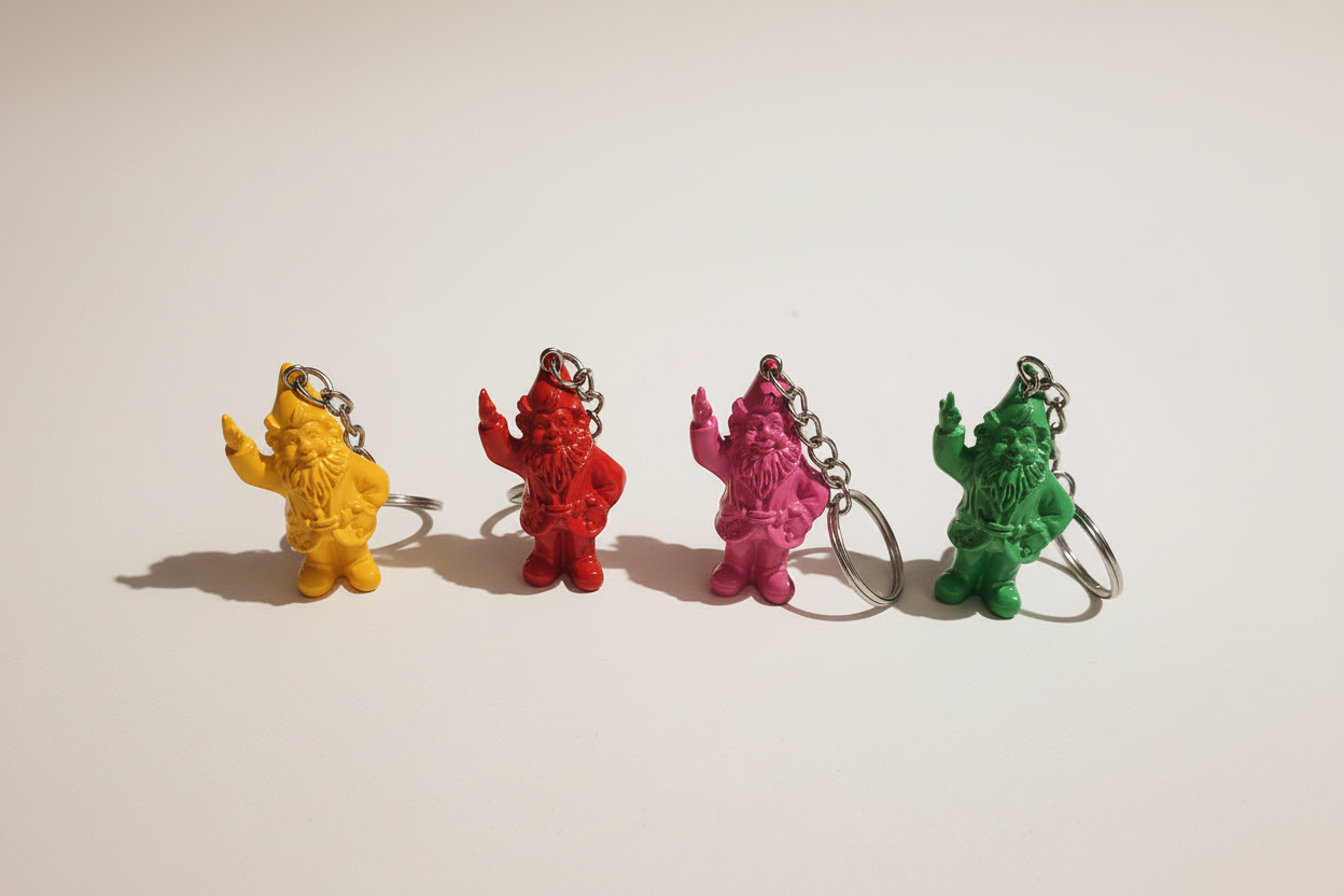 Dieser witzige Schlüsselanhänger zeigt einen frechen Gartenzwerg mit ausgestrecktem Statement-Finger – ein humorvolles Accessoire für alle, die es direkt mögen. Erhältlich in vier angesagten Farben, passt er perfekt an deinen Schlüsselbund und bringt täglich ein Lächeln ins Gesicht. Das ideale Geschenk für Gartenfans und Liebhaber von witzigen Details.