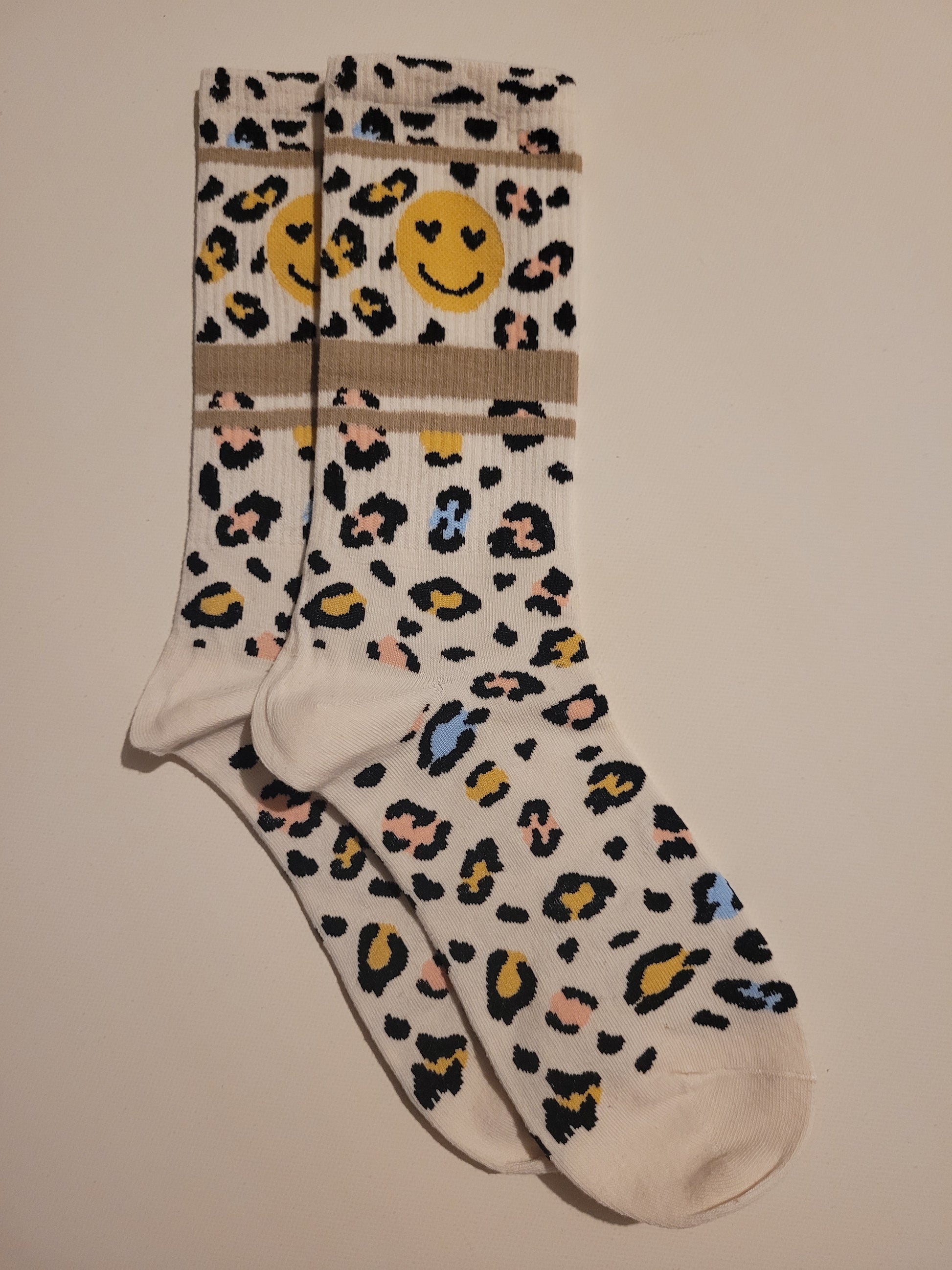 Diese stylischen Socken im Leo Muster mit Beigen und grauen Zierstreifen sowie verspieltem Smiley setzten ein modisches Statement und verleihen jedem Outfit eine individuelle Note. Ideal für alle, die Stilbewusstsein mit einem Hauch von Humor kombinieren möchten.