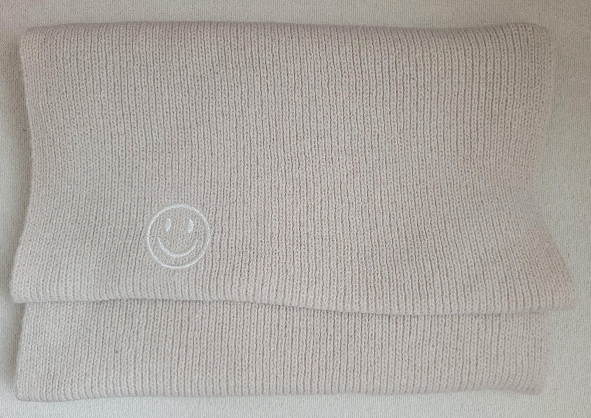 Der gestrickte Wollschal in hellem Beige kombiniert Viskose und Wolle zu einem weichen, kuscheligen Tragekomfort. Sein schlichtes Design macht ihn zu einem vielseitigen Accessoire, das sich mühelos mit jedem Outfit kombinieren lässt. Das dezent gestickte weiße Smiley-Emblem verleiht dem Schal eine subtile, individuelle Note und hebt ihn stilvoll hervor, ohne aufdringlich zu wirken. Ein hochwertiges Stück, das Funktionalität mit zeitloser Ästhetik verbindet.